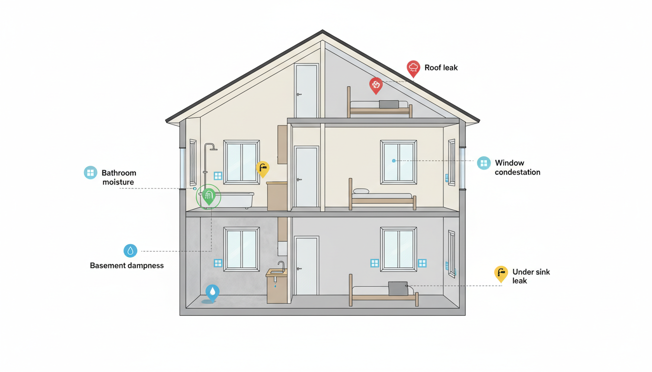 - Bathrooms, laundry rooms, and kitchens with high humidity levels and poor exhaust fans or air conditioning use