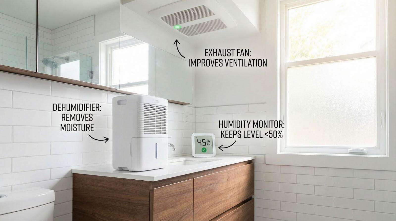 percent using dehumidifiers or air conditioner systems and repair roof, plumbing, or window leaks promptly to prevent water damage. - Use exhaust fans. Run exhaust fans in bathrooms, kitchens, and